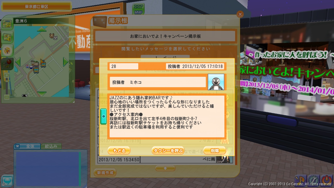 家においでよ!(キャンペーンにのってみた) Category:meet-me Date:2013年12月05日 こんなかんじのJAZZの似合う隠れ家的なBARです 私が居心地のいい空間をつくっただけなのですが ゆったりとすごせると思います(*´ω`*) 店員のトナカイさんがいつも暖かく迎えてくれます (たぶん・・・) お家においでよ!キャンペーンにのってちょっと宣伝してみました 市場前のMM不動産前に専用掲示板からタクシーで来ることができます ところで一番上の画像はちょっと前に ブログに使おうとおもって加工しておいたのですが 今日インしてみたら トナカイさん・・・鼻 充血してますよ PR